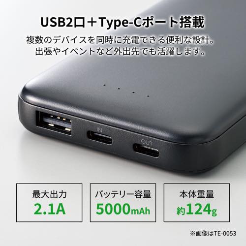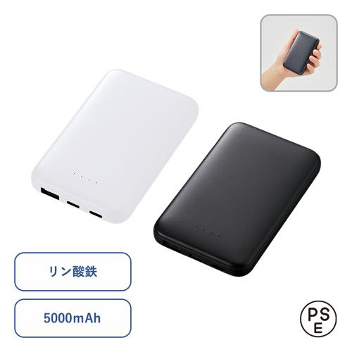 | 備 考 | 付属品/取説付、Type-Cケーブル付属、残量表示ランプ付 最大出力2.1A、バッテリー容量5000mAh、本体重量約124g [A8] |