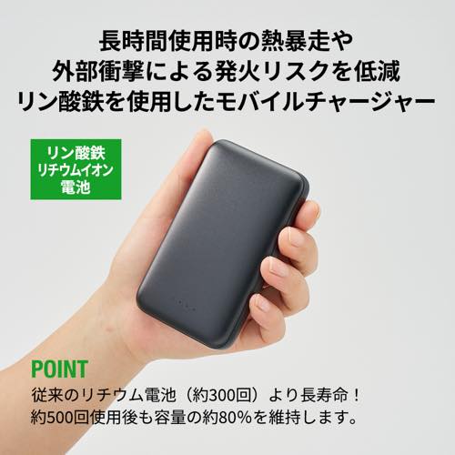 リン酸鉄を使用した、発火リスクの少ないモバイルチャージャーです。