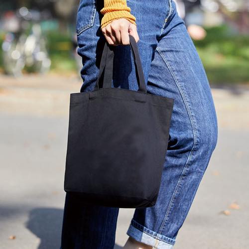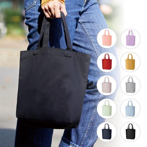 豊富な色展開が嬉しいコットン生地のトートバッグです。ペットボトルが縦にキレイに入るサイズ感で、デイリーユースのトートとしてご利用いただけます。縦よりも横幅が広いタイプのバッグをお探しの方にもおすすめです。印刷方法も単色からフルカラー印刷まで対応しており、お好みのデザインでオリジナルトートバッグを作成出来ます。販路としても幅広いものがありノベルティや物販など、幅広い用途にご利用いただけます。